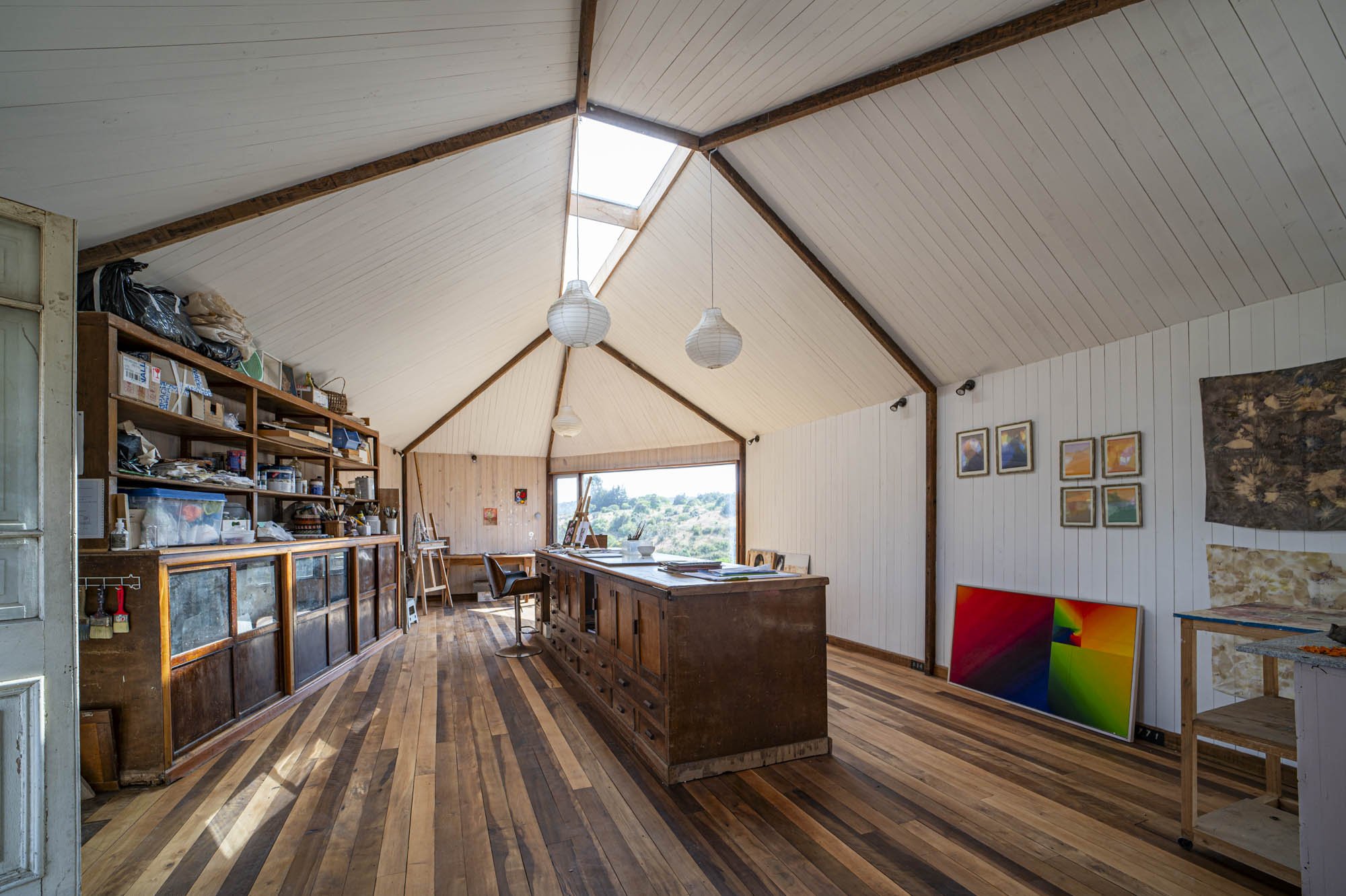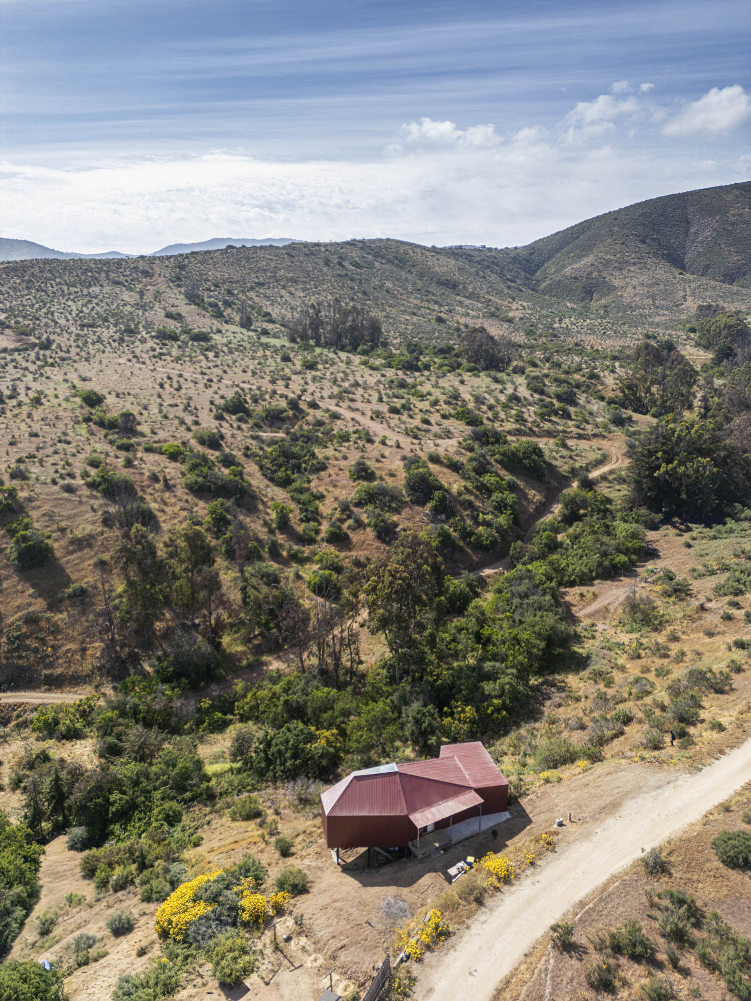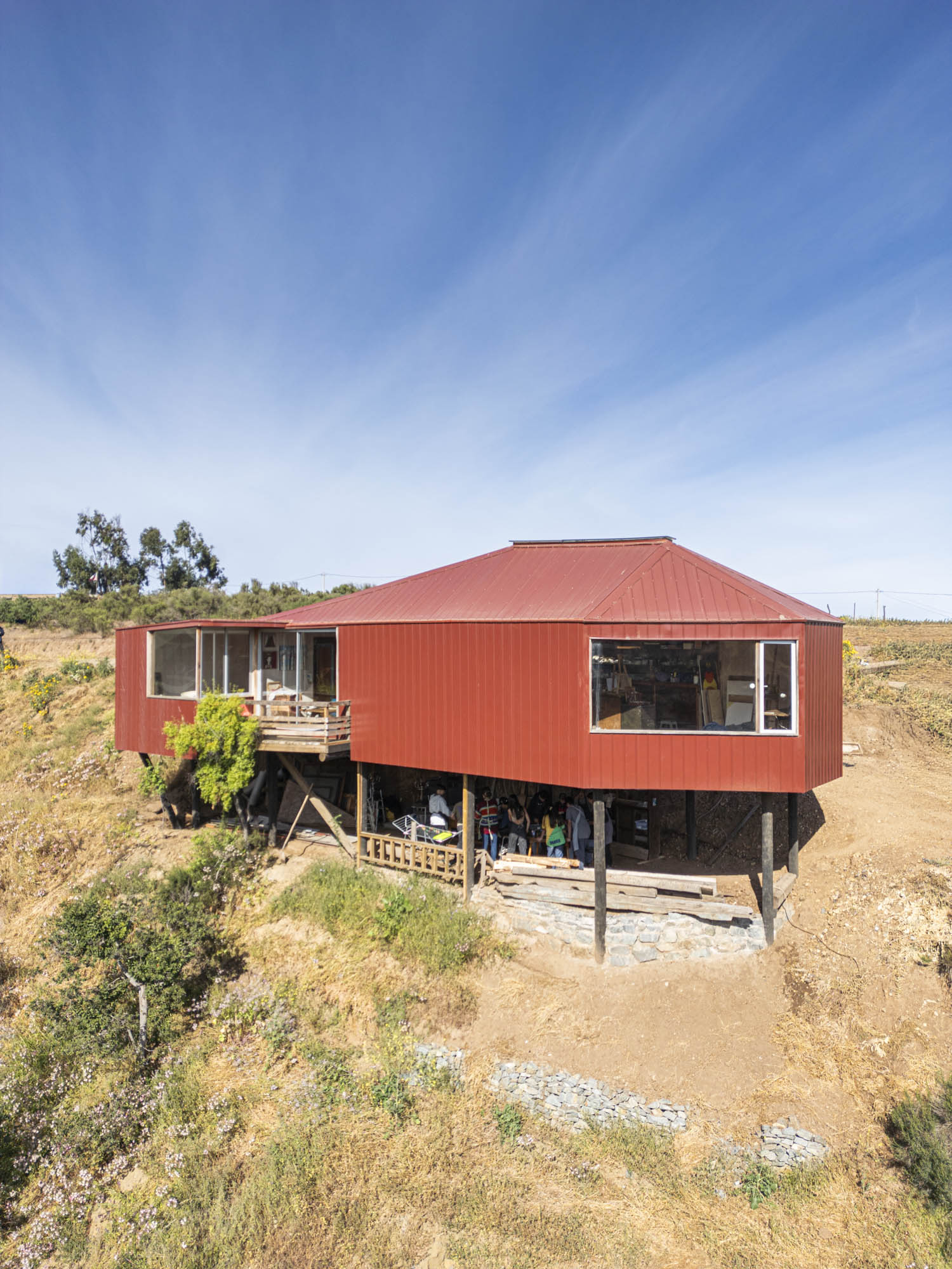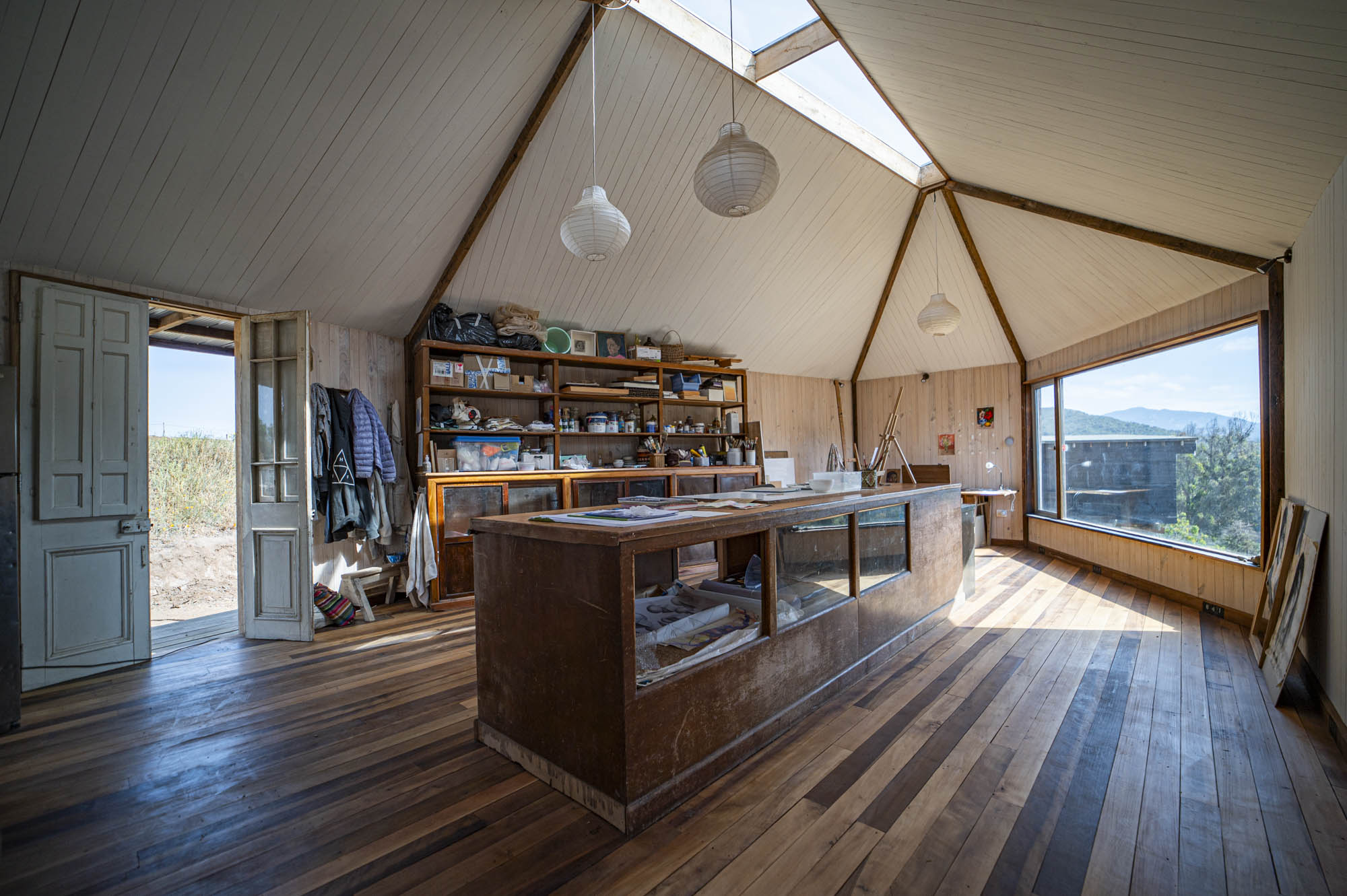 El exterior se define por una forma simple y alargada, revestida en paneles metálicos rojos que dialogan con los tonos terrosos del cerro. Desde la distancia, la estructura se percibe como un mirador discreto: apoyado sobre pilares delgados, abierto hacia el valle y en armonía con la topografía. En su interior, el espacio se organiza dentro de una envolvente cálida de madera, atravesada por un lucernario central que recorre toda la cumbrera. Esta apertura lineal inunda el taller con una luz suave y pareja, ideal para el trabajo artístico. Las ventanas de gran formato enmarcan vistas lejanas y establecen un diálogo constante entre la creación y el paisaje, reforzando el carácter del taller como espacio de observación y contemplación.