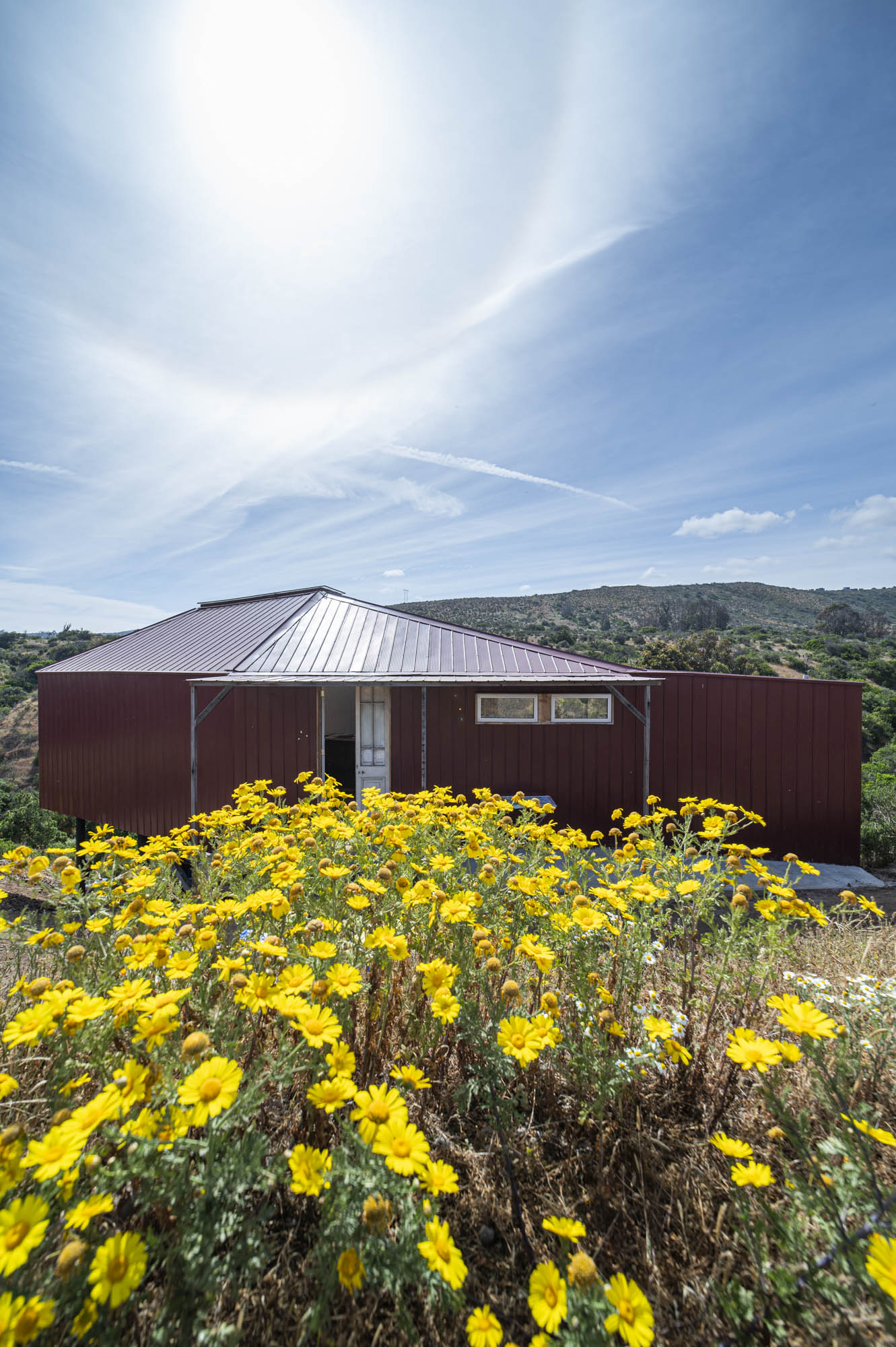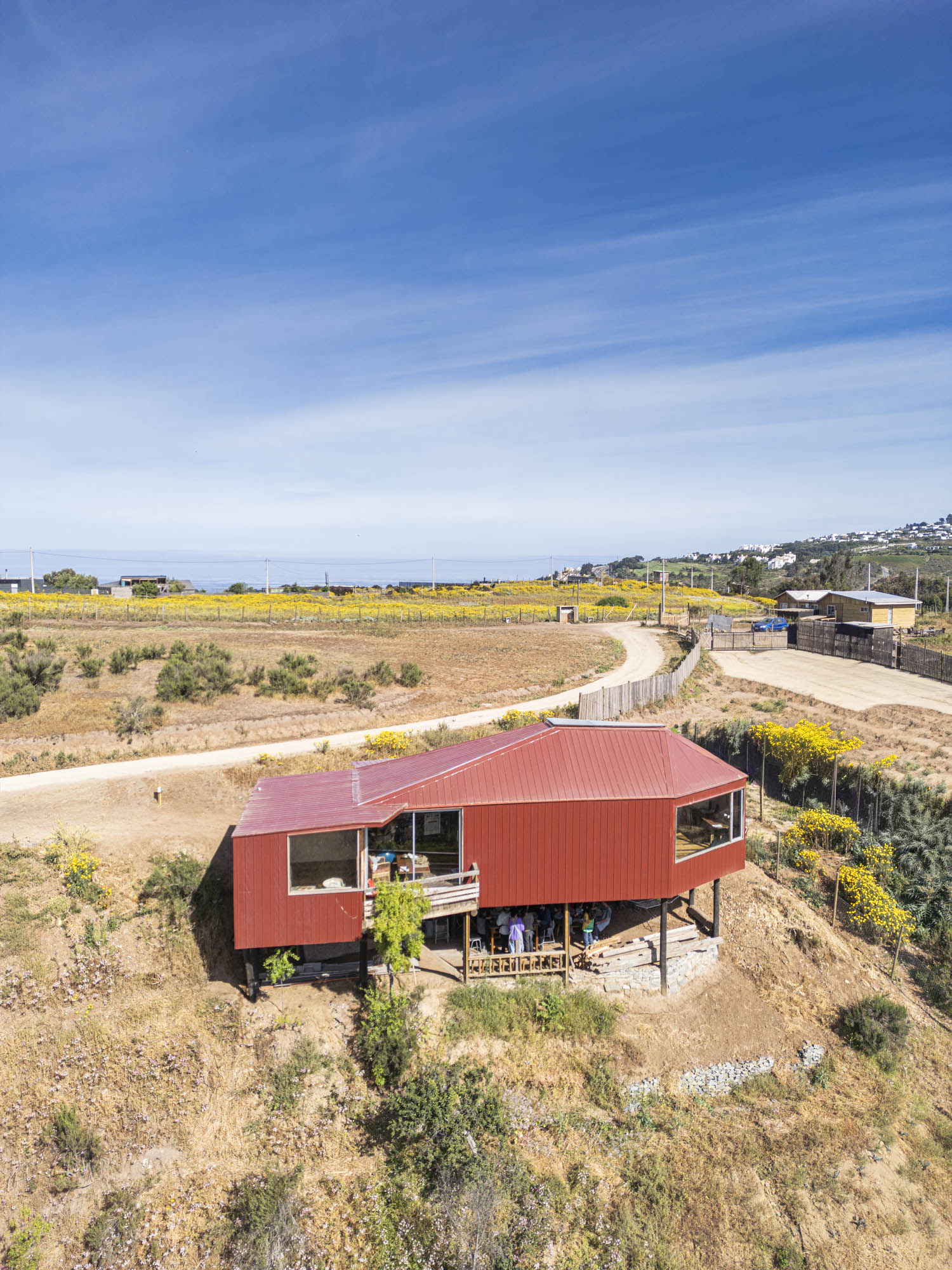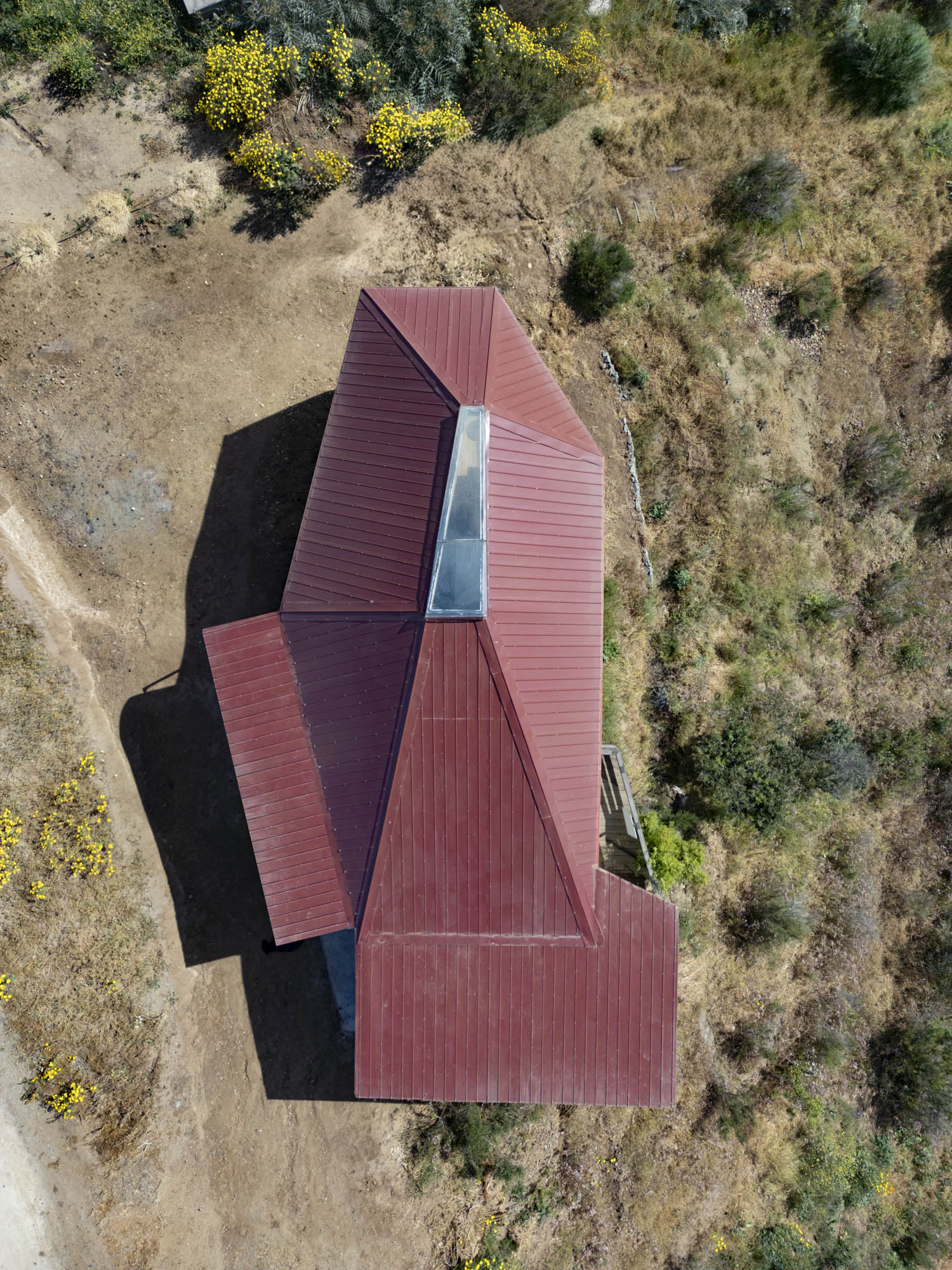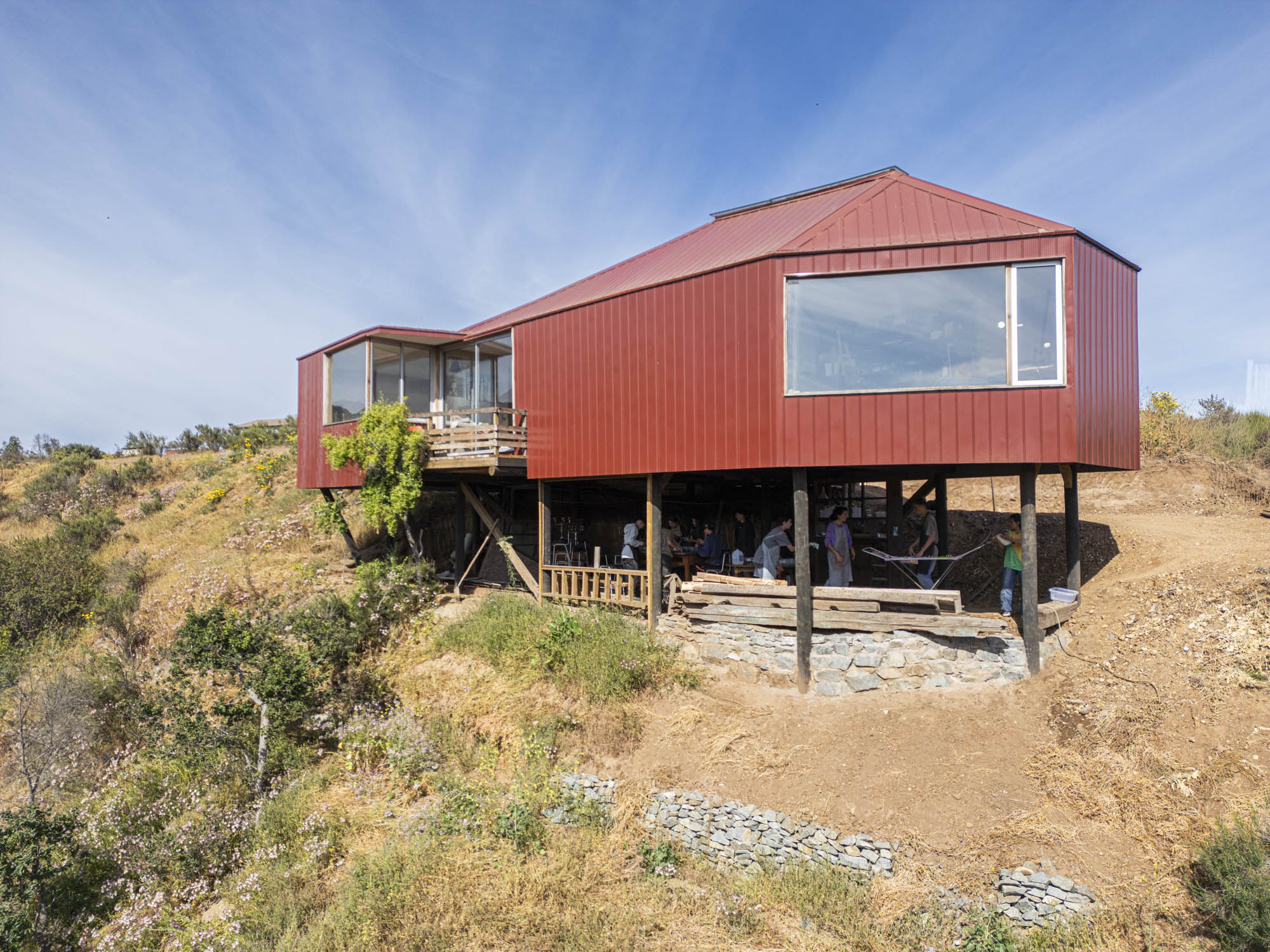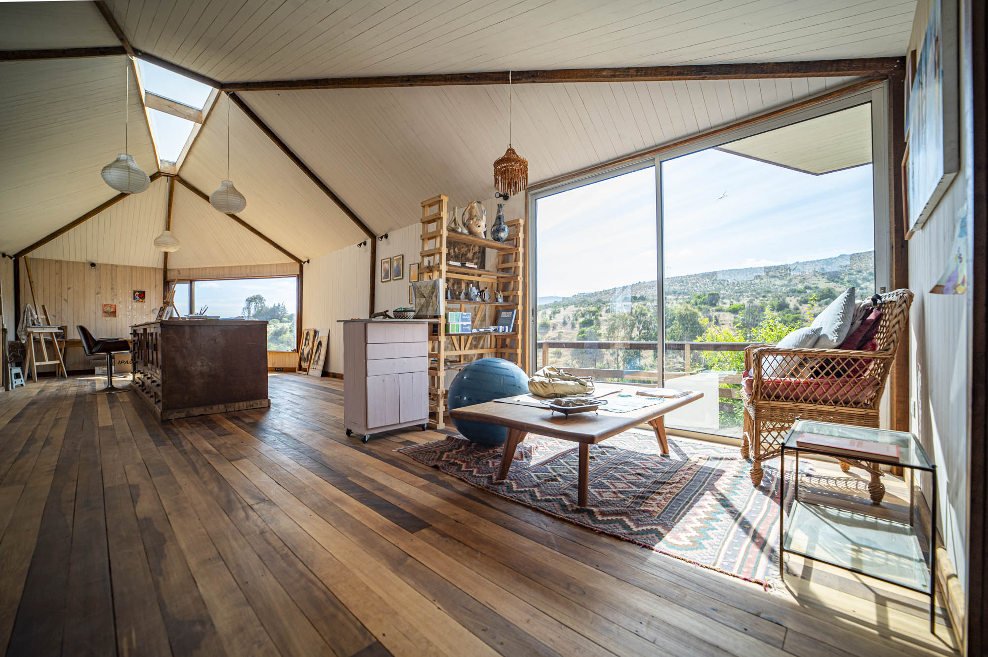 El exterior se define por una forma simple y alargada, revestida en paneles metálicos rojos que dialogan con los tonos terrosos del cerro. Desde la distancia, la estructura se percibe como un mirador discreto: apoyado sobre pilares delgados, abierto hacia el valle y en armonía con la topografía. En su interior, el espacio se organiza dentro de una envolvente cálida de madera, atravesada por un lucernario central que recorre toda la cumbrera. Esta apertura lineal inunda el taller con una luz suave y pareja, ideal para el trabajo artístico. Las ventanas de gran formato enmarcan vistas lejanas y establecen un diálogo constante entre la creación y el paisaje, reforzando el carácter del taller como espacio de observación y contemplación.