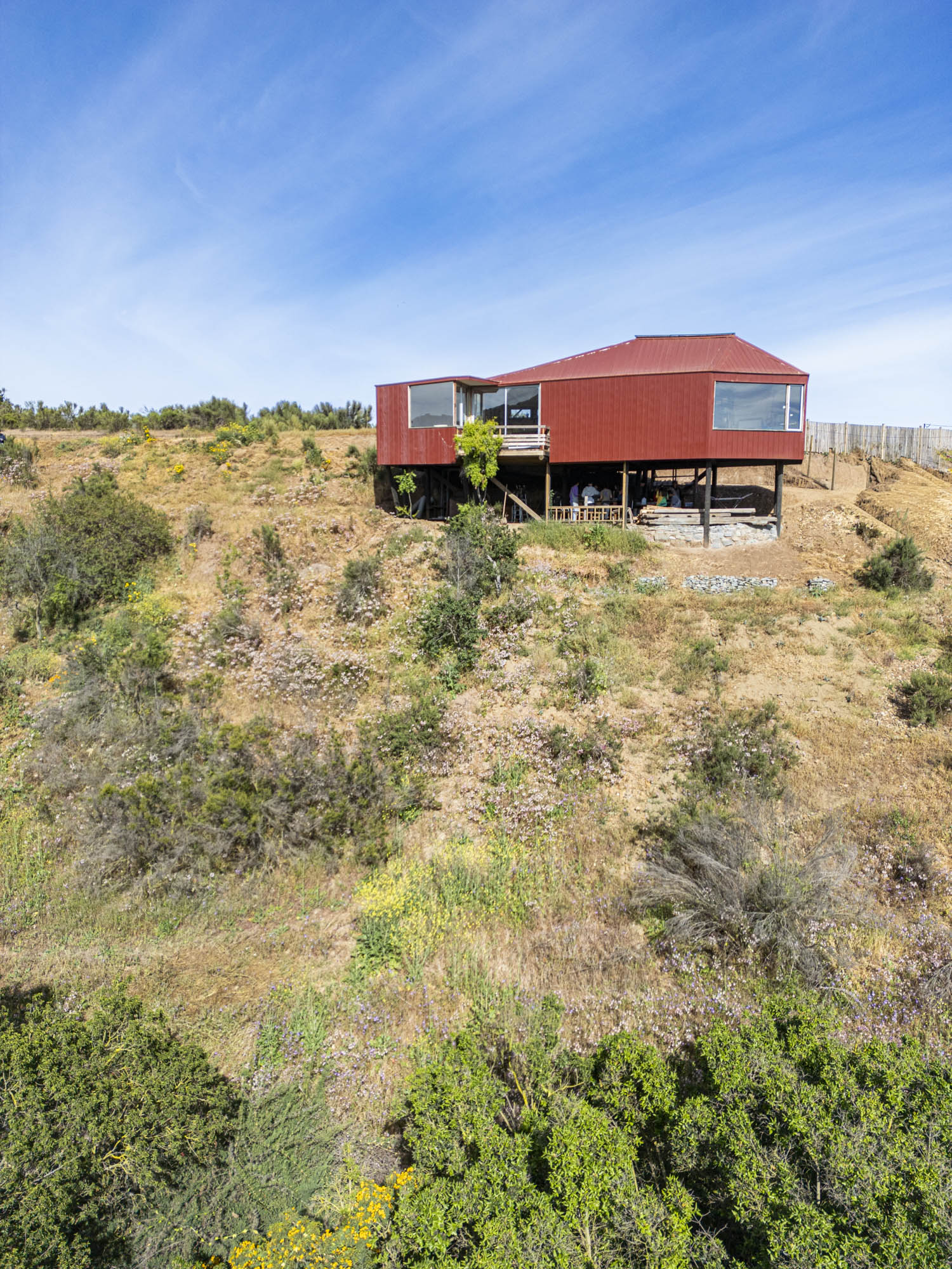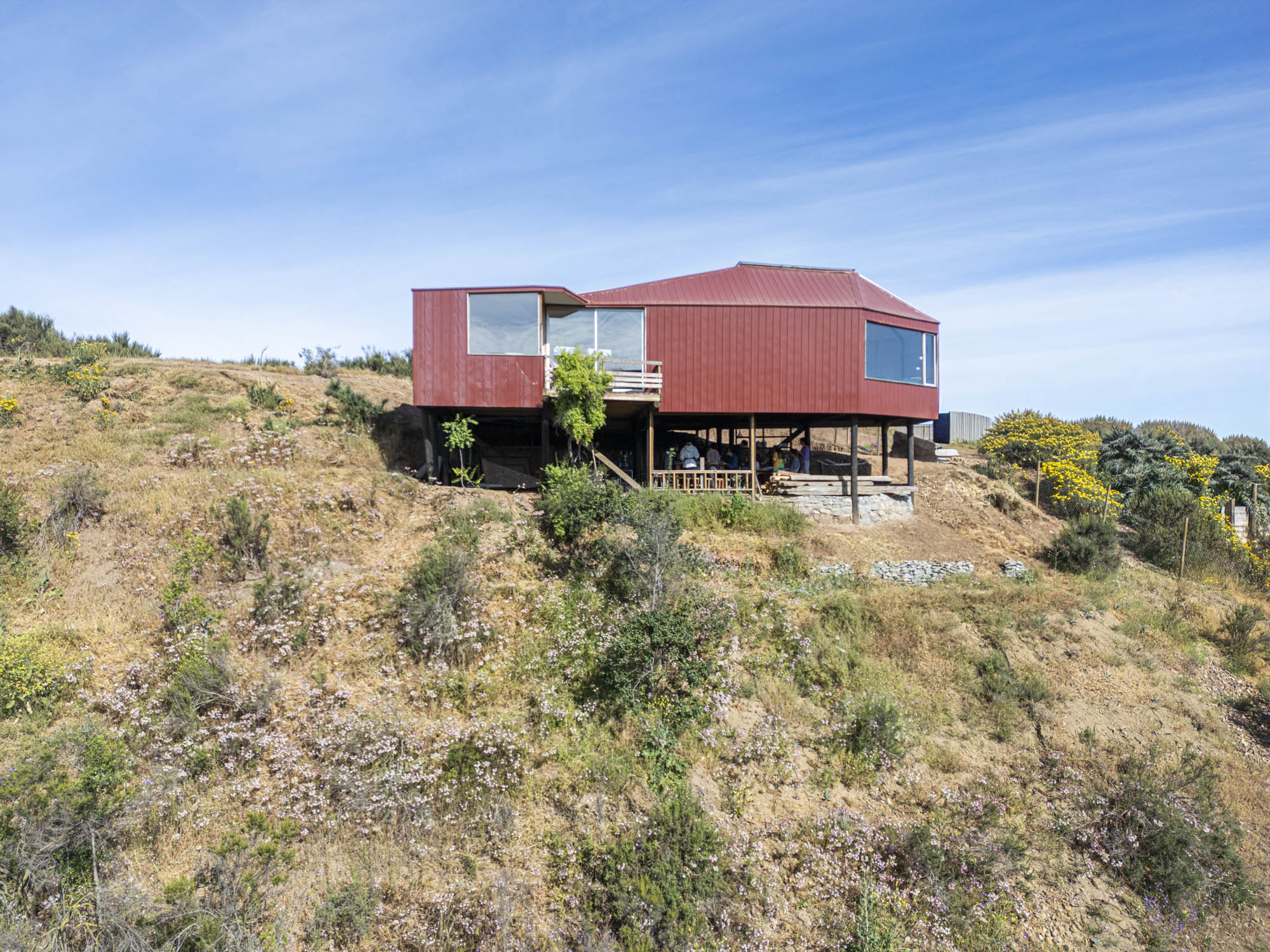 Ubicado en la ladera de una quebrada en la zona central de Chile, este taller de artista fue concebido como un refugio tranquilo suspendido entre el paisaje y el cielo. NOS Arquitectura diseñó y construyó este volumen liviano y elevado, que se posa suavemente sobre el terreno para reducir la intervención y permitir que la flora nativa continúe creciendo de forma natural a su alrededor.